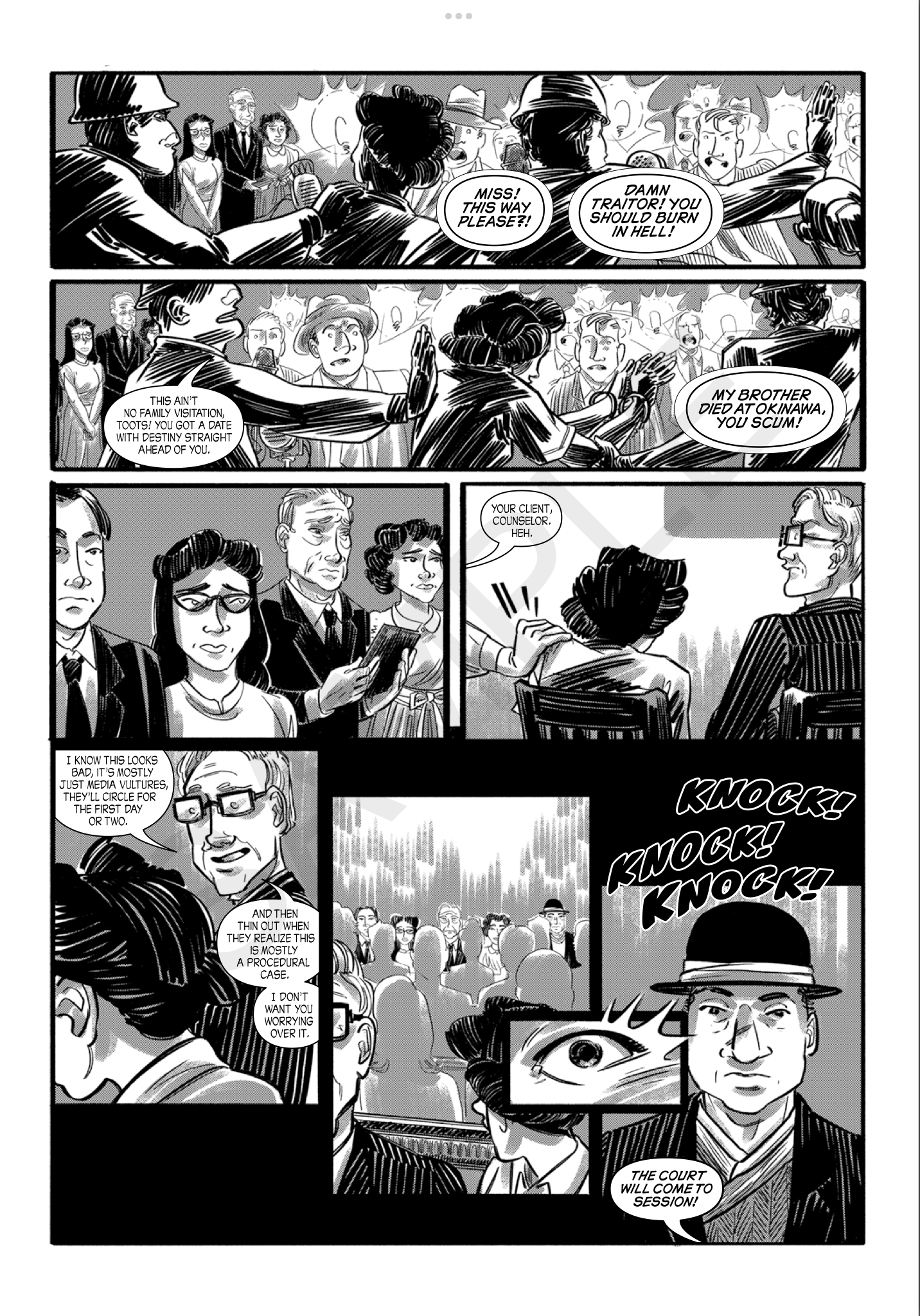 As is always the case, any good graphic novel needs an artist, and stepping up to the plate for this one is Kate Kasenow. Likewise feeling the need to do justice to Iva’s story, Kasenow comes in with a relatively loose black & white style. In her characters, she’s done a great job of portraying the distinct features of a pretty large cast, making sure that no one person looks like any other (not so easy a thing in a two-tone book). With a few strokes of the pen, Kasenow is able to show emotional content in her facial features, putting emphasis on the personalities of the people she’s drawing. In her settings, she pays close attention to the style and look of the era, without crowding the panels or cluttering the page. I’ll go on the record as saying that black & white comics don’t always work when an artist tries to cram in too much detail, but it’s a thing of beauty when an artist trusts their work enough to use a more minimalist approach. Kate Kasenow is in the latter group.