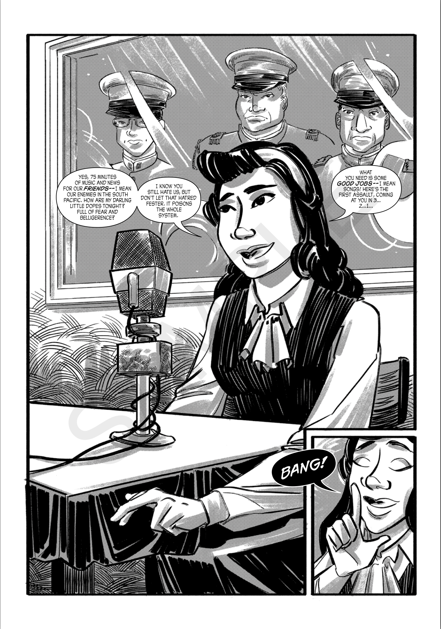Writer Andre Frattino felt strongly about the subject of Tokyo Rose. In his youth, he spent a fair amount of time glued to any screen that happened to be playing a World War II movie or show. He was further motivated by the life of his grandfather, Stanley Kuchinski, who served in the United States Marine Corps (Semper Fi, sir), was stationed at Pearl Harbor and saw action at The Midway, Tulagi, Guadalcanal, Guam, & Okinawa. One thing made clear in Frattino’s forward for the book was that he was serious about getting past all of the caricatures of the Tokyo Rose persona, to dig into the facts surrounding young Iva Toguri in particular. Out of that research, he’s put together a fantastic story about a young lady who is pushed into an impossible situation & came out of it remaining true to herself. The narrative is entertaining, showing all of Iva’s wry humor and determination, while never flinching away from the wrongs done to her by both the American & Japanese government.