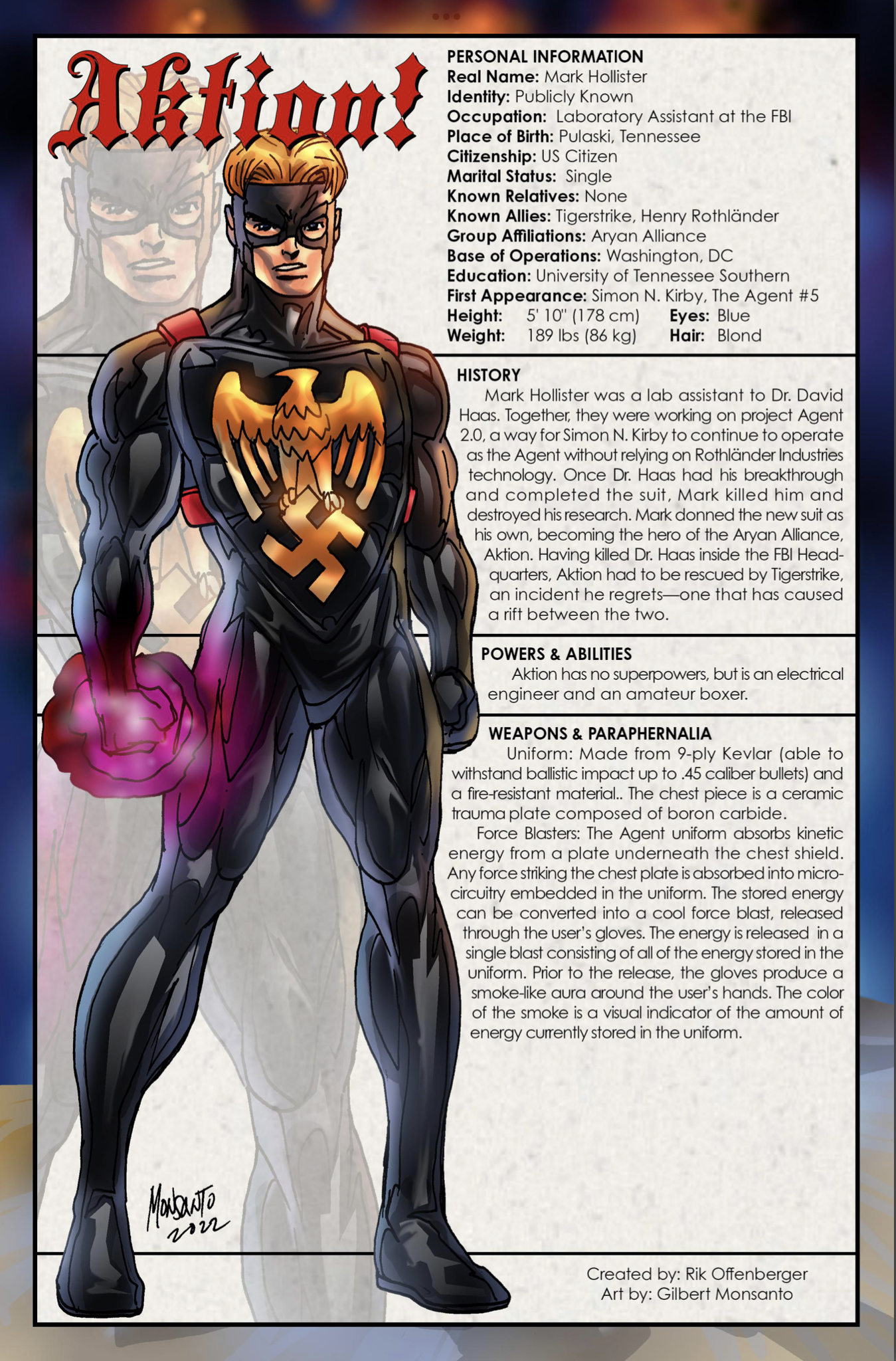 Agent Kirby tries to break away from his dependants on technologies developed by Henry Rothländer. As the FBI begins to develop their own tech for Agent Kirby, they quickly discover that it isn’t as easy as they may have hoped to separate the agency from Rothländer Industries. Enter Aktion, the Rothländer Industries insider who will stop at nothing to stop Agent Kirby’s ambitions, and if that weren’t enough Tigerstrike returns from the page of G-Men United!