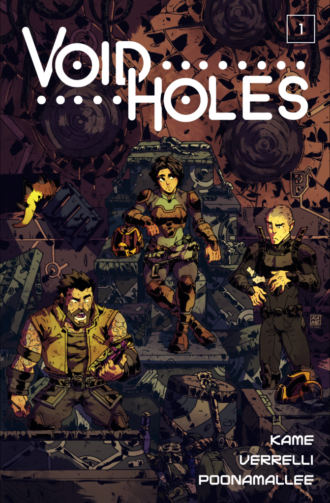 Void Holes (available now through Kofi & GlobalComix) is a sci-fi adventure following the crew of the Sun Basher – Lewp, Sync, and Ki. This first issue features three independent but connected 8-page stories about these lovable voidholes that call themselves a crew.