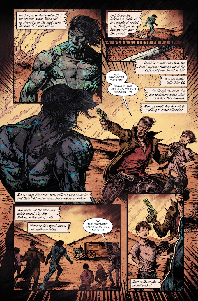 As he’s referred to in Frankenstein the Unconquered, the Beast couldn’t care less about what you think of him. He’s less the brooding anti-hero and more the vengeful barbarian with anger control issues out of a Robert E. Howard story. Despite the risk of losing readers who insist on the notion that they have to connect, or even like, the main character of a story, I think writers Dalton Shannon & Wells Thompson made a good move. By taking a more difficult approach, going out of their way to make their Beast as unlikeable as possible instead of taking an easier track, they improve the odds of their book standing out.