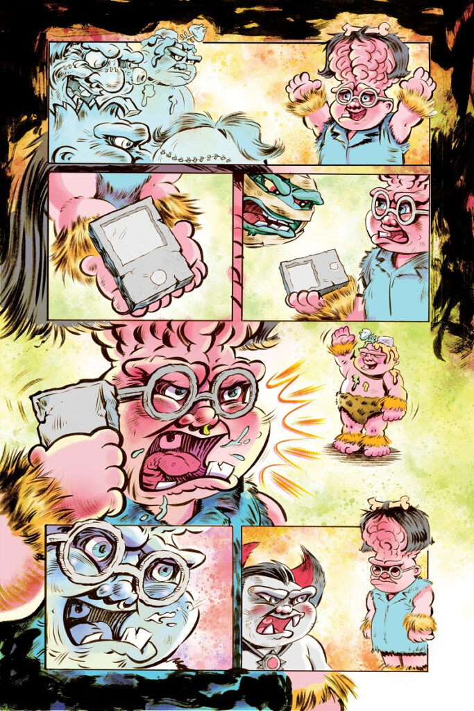 This time around, the chaos simply cannot be confined to a single neighborhood, as the crew traces the entire history of the infamous feud as it oozes across the ages! The first issue jumps all the way back to the dawn of time — chronicling the initial one-upmanship of the Cro-Madballs and Neanderthal Pail Kids.