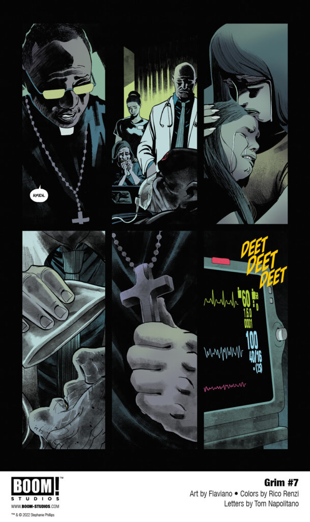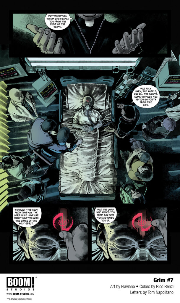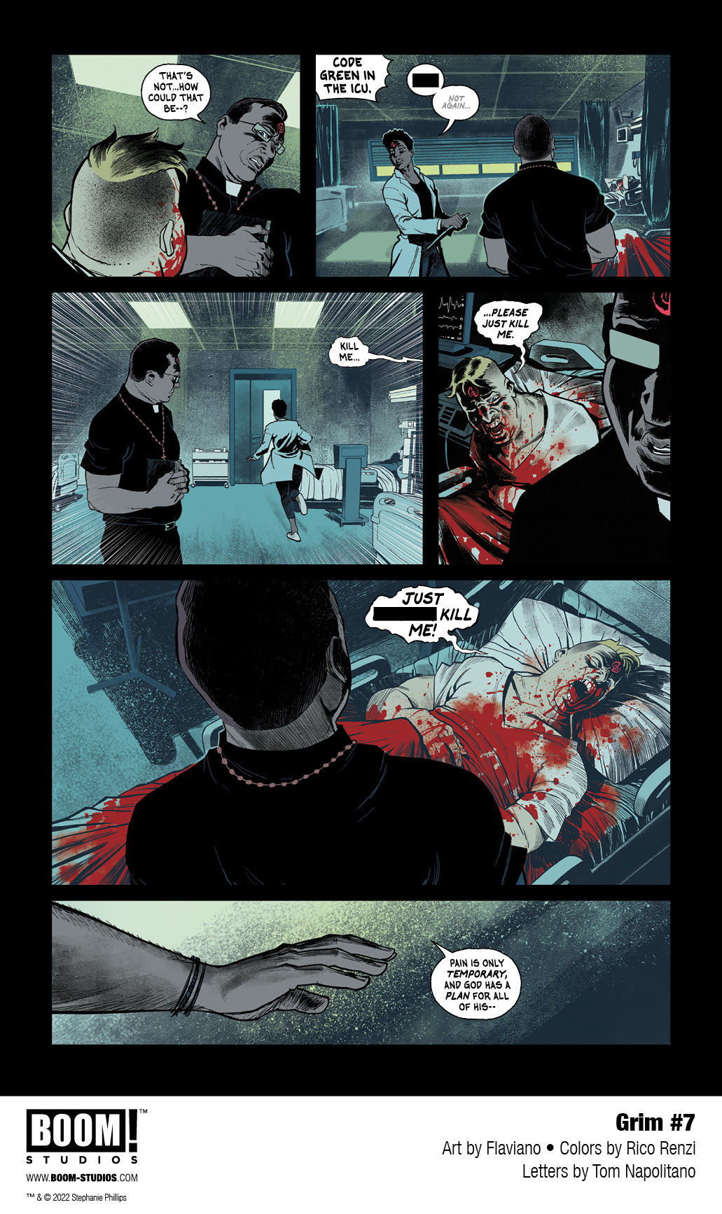 BOOM! Studios revealed today a first look at GRIM #7, the next issue in the hit bestselling comic book series from acclaimed writer Stephanie Phillips (Harley Quinn, Wonder Woman), fan favorite artist Flaviano (New Mutants), colorist Rico Renzi (Spider–Gwen), and letterer Tom Napolitano (The Joker), as Jessica Harrow and her fellow Reapers face new gods, beasts, and dangers in the underworld and beyond.