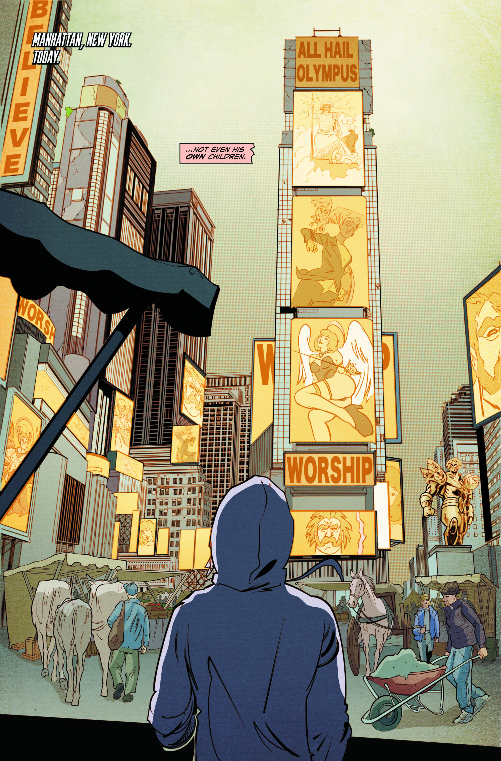 Now let’s talk about the artistic team. Francesco Archidiacono, Marc Deering, and Lee Loughridge tackled this story about gods and men with gusto. Francesco’s pencils lay the foundation for a story that has to be, by its nature, larger than life. Readers move along from the mortal city of Manhattan, with all of the requisite Time Square advertisements dedicated to the Greek pantheon once again reigning over humanity, and on to the pristine & shining halls of the new Olympus. Likewise in the character designs, Francesco does an outstanding job of portraying how these old gods might update their looks for modern times, all drawn at the pinnacle of beauty.