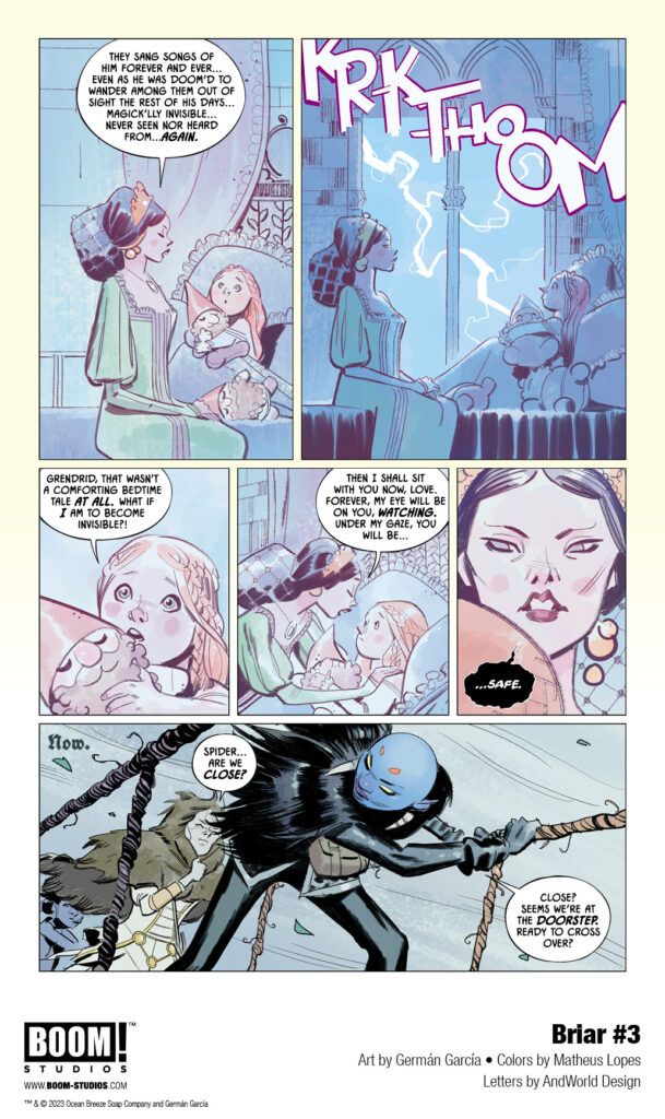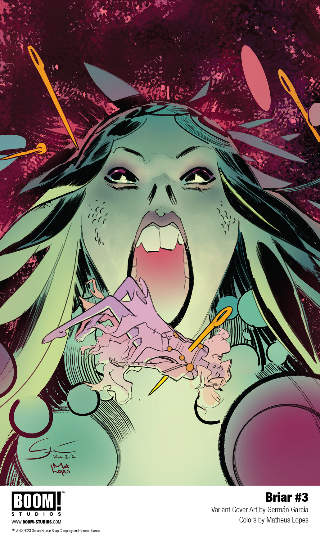 BOOM! Studios revealed a first look at BRIAR #3, the next issue of the brand new four-issue limited comic book series from Eisner Award-nominated writer, producer, and director Christopher Cantwell (Regarding the Matter of Oswald’s Body, Iron Man, Halt and Catch Fire), rising star artist Germán García (Ka-Zar: Lord of the Savage Land), colorist Matheus Lopes (Supergirl: Woman of Tomorrow), and letterer AndWorld Design (The Many Deaths of Laila Starr) that reimagines the classic fairy tale as an epic dark fantasy adventure, available February 2023.