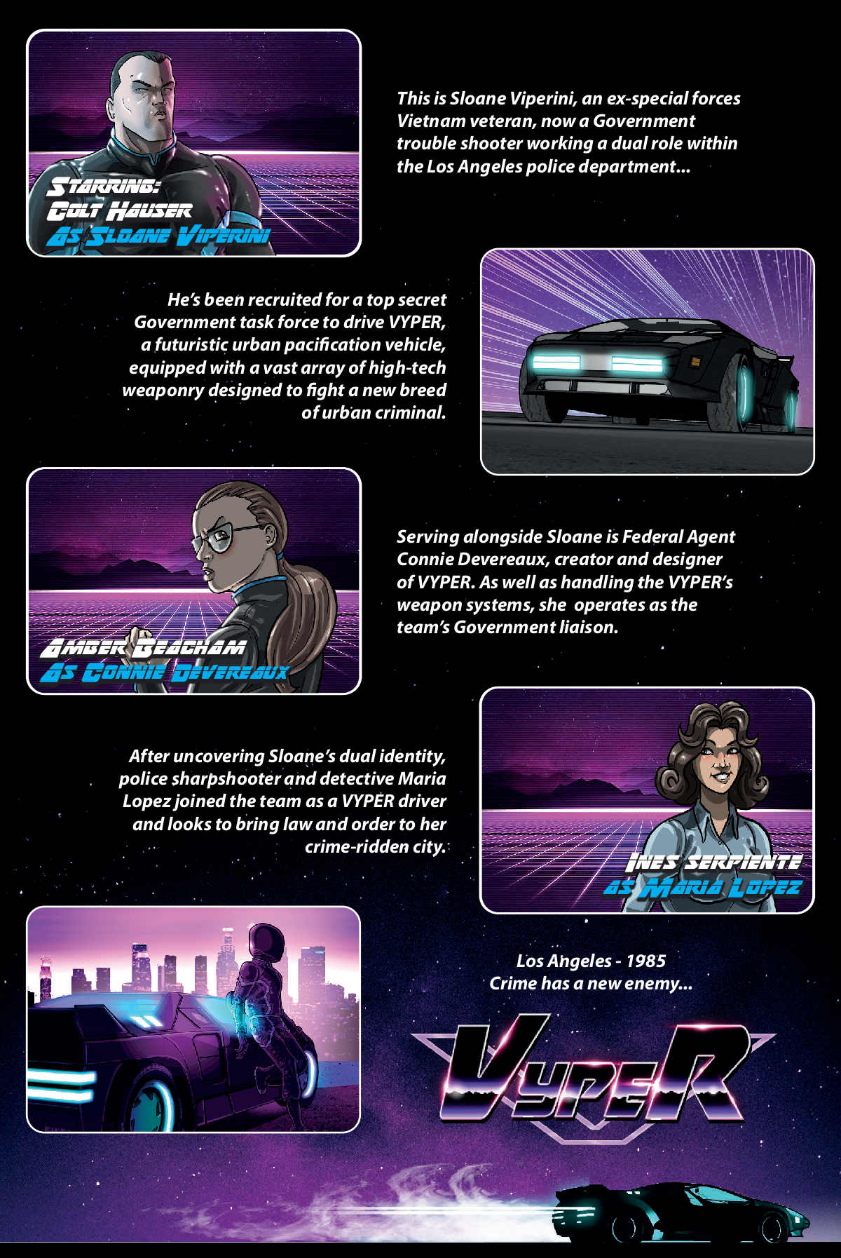VYPER is an comic book set in a Los-Angeles 1985. We follow the adventures of Sloane Vyperini, a federal agent tasked with driving high-tech pacification vehicle codenamed: VYPER.