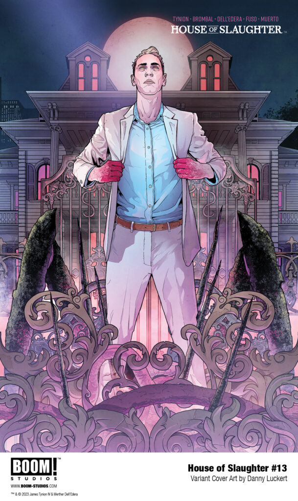 HOUSE OF SLAUGHTER #13 features main cover art by famed illustrators Mateus Manhanini (Wakanda) and co-creator Werther Dell’Edera with Miquel Muerto, as well as variant cover art by acclaimed artist Danny Luckert (Shock Shop), and Tonči Zonjić (Skulldigger + Skeleton Boy).