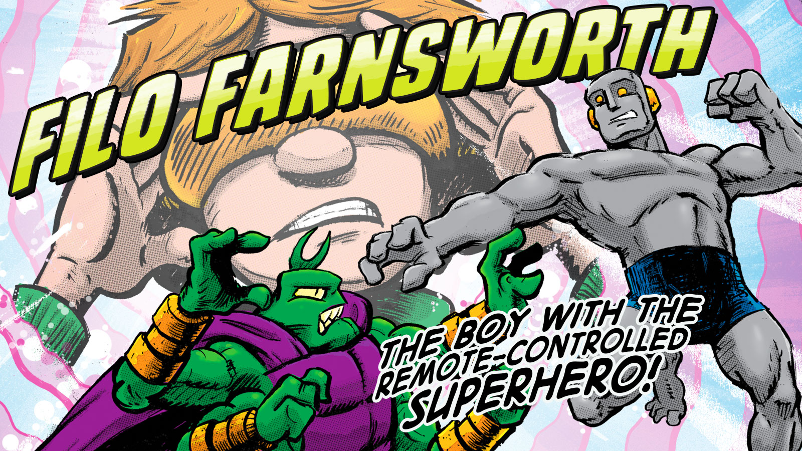 Using GRAY MAN, a cosmic-powered super-hero animated by his own mind, Filo must thwart an alien invasion and stay one step ahead of government agents who want Filo’s power for themselves!