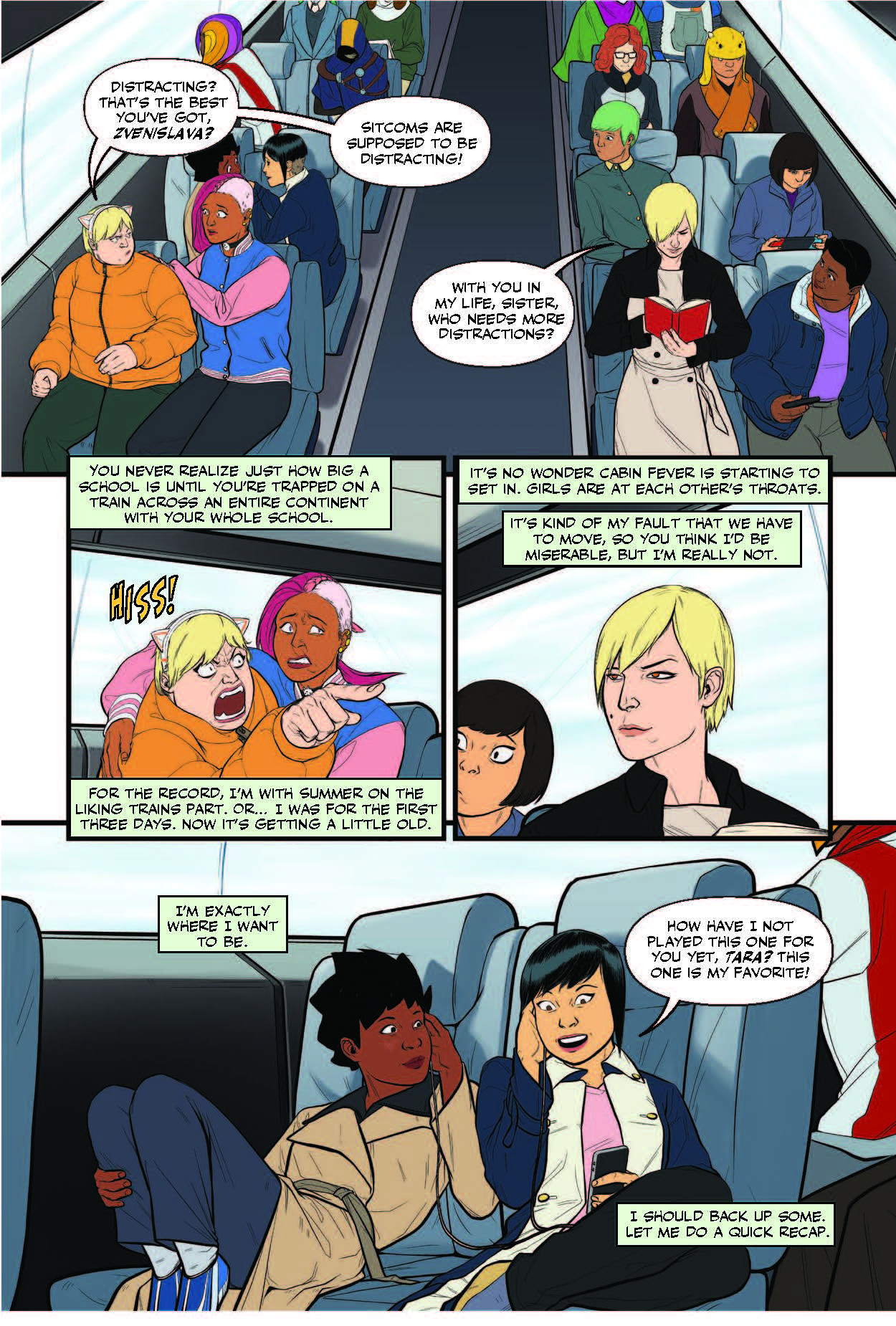 There’s no getting around it, so for people who did not read the first instalment and are unfamiliar, we’re just going to make the Hogwarts comparison right off the bat. We’ve got students of different backgrounds, all united by the fact that they’re all extraterrestrials who have a knack for getting themselves and their peers into trouble. Coincidentally, given their various aptitudes and abilities, the core group of besties (Tara, Misako, Kat, Zvenislava, & Summer) is also a fair hand at getting themselves out of trouble.
