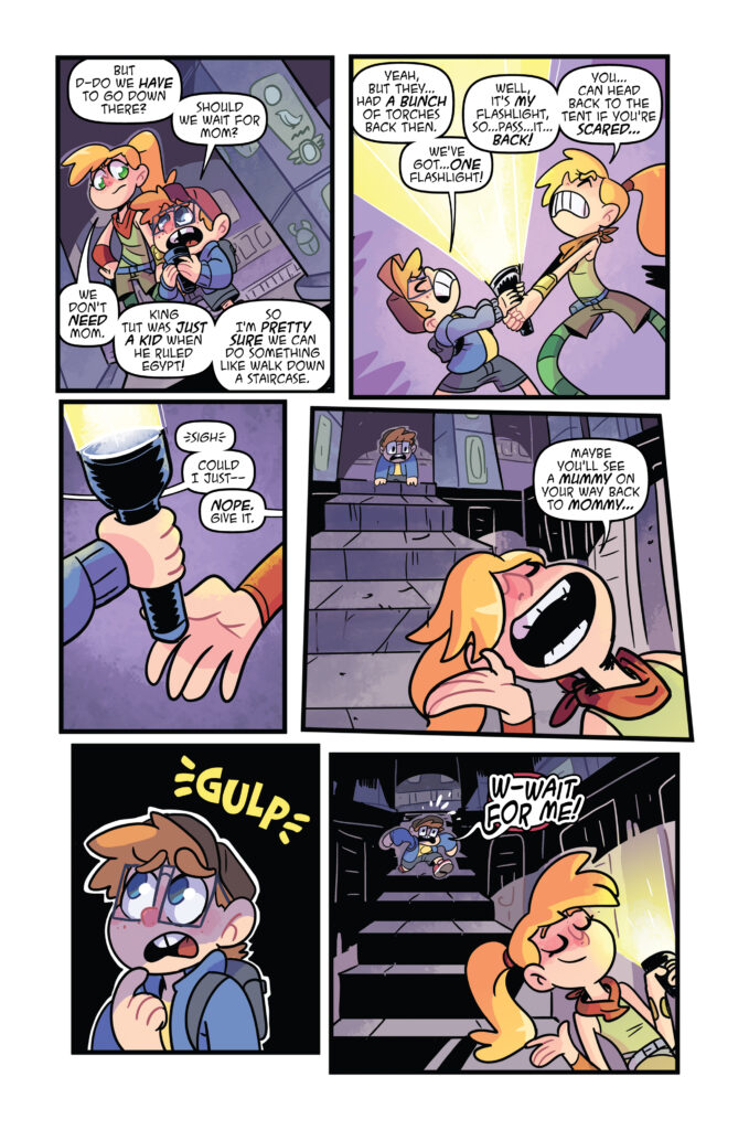 While on a trip to Egypt, two siblings, Otto and Nan, stumble upon a sarcophagus. And they accidentally free a mummy cat from a pharaoh’s chamber! Now tasked with finding it, their resulting adventure has them exploring the city, learning historical facts, saving each other from danger, and discovering truths about life. What’s more, they’re going to survive the same adventure – twice! See both perspectives in this flip graphic novel, written by real-life siblings Kim Shearer and Chas! Pangburn.
