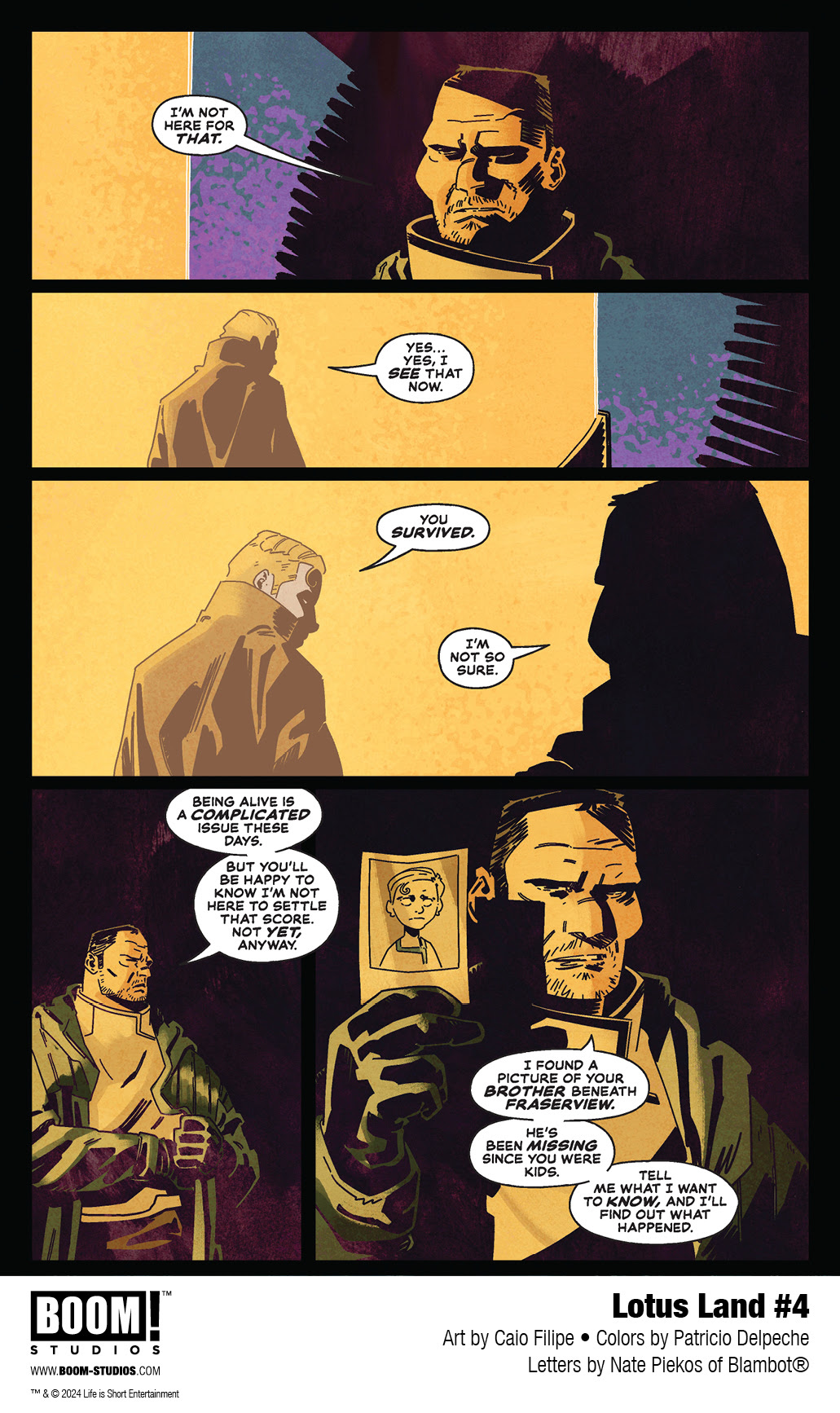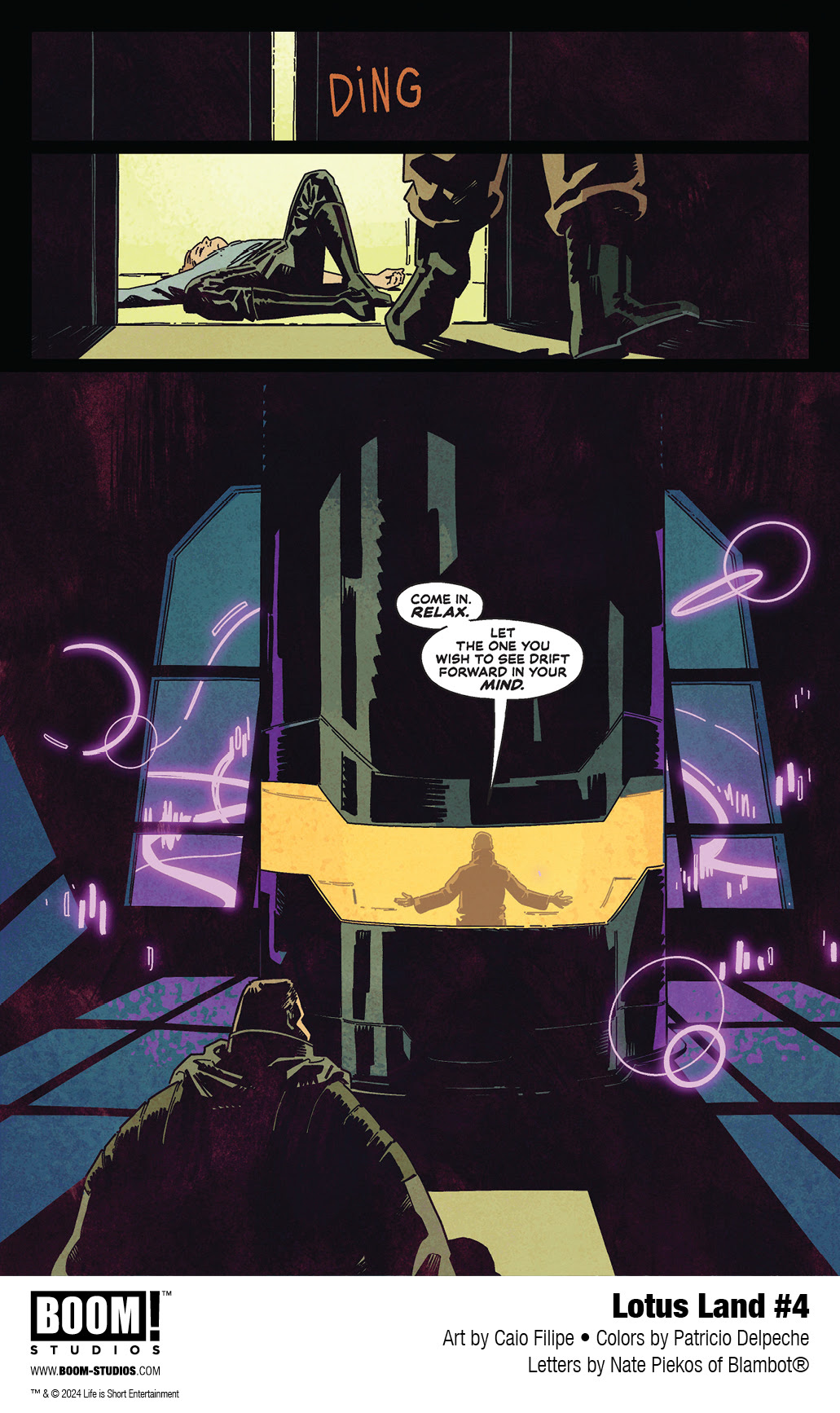 BOOM! Studios revealed a first look at LOTUS LAND #4. Eisner-winning and Harvey-nominated writer and director Darcy Van Poelgeest (Little Bird) is joined by artist Caio Filipe (Stranger Things: Tales From Hawkins), colorist Patricio Delpeche (Angel), and letterer Nate Piekos of Blambot® (The Seasons Have Teeth) for a timely look at the human condition, set in a dystopic, cyberpunk future that’s as grounded as it is metaphysical. Welcome to LOTUS LAND, available February 2024.
