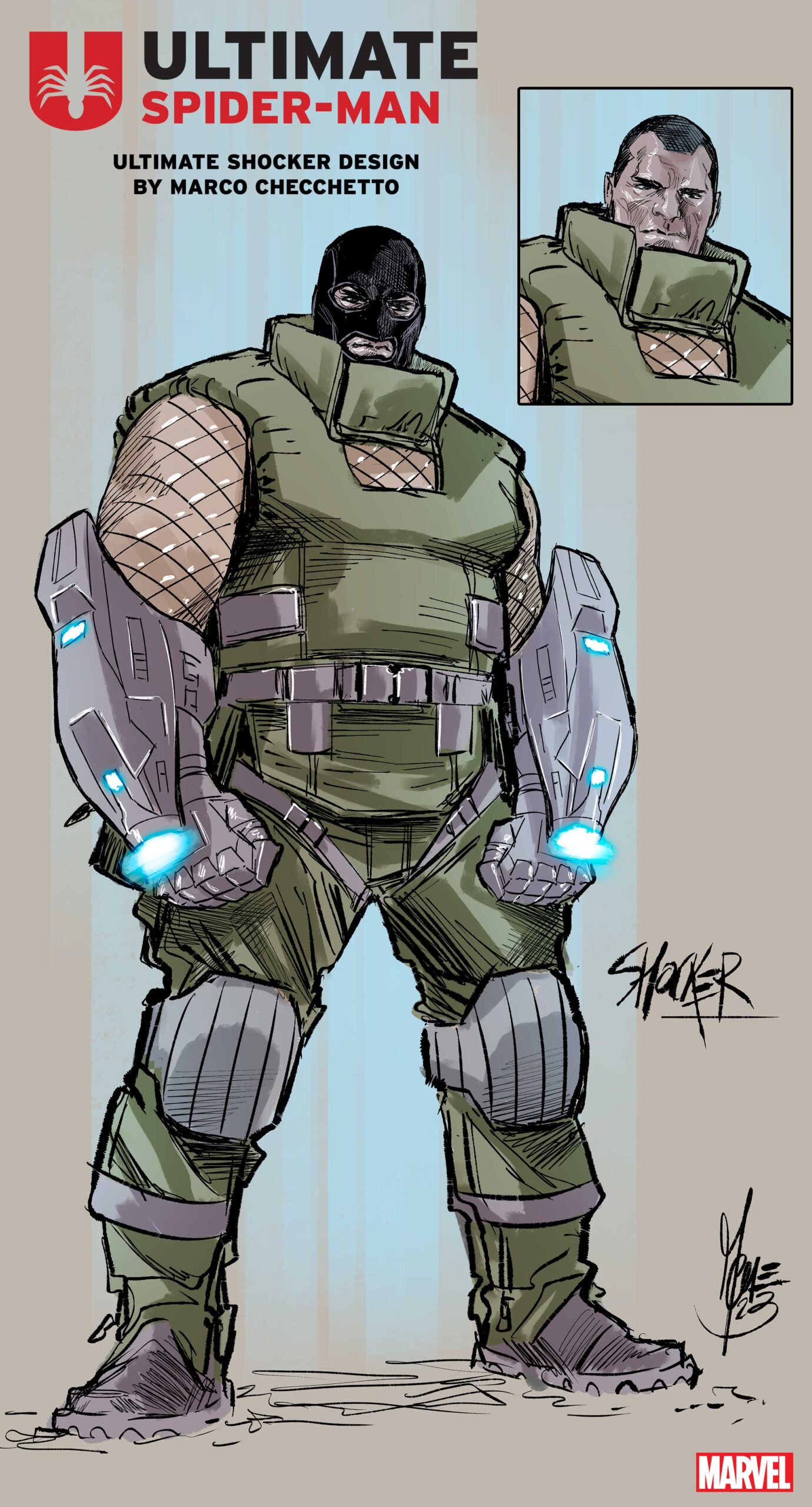 “Throughout our run, expect changes and both classic and new versions of characters,” he continued. “One of the first you’ll meet is Shocker. He’s at the beginning of his career, so I wanted to create something different. Shocker wears a bomb squad suit to protect himself from the powers of his gloves, but still maintains some details of his classic costume. I had a lot of fun, and I believe it helps convey that we are at the dawn of a new storytelling universe. I would also like to talk about the origin of the Green Goblin’s design, but I think it’s more exciting to let you discover it by reading the fantastic story created by Jonathan!”