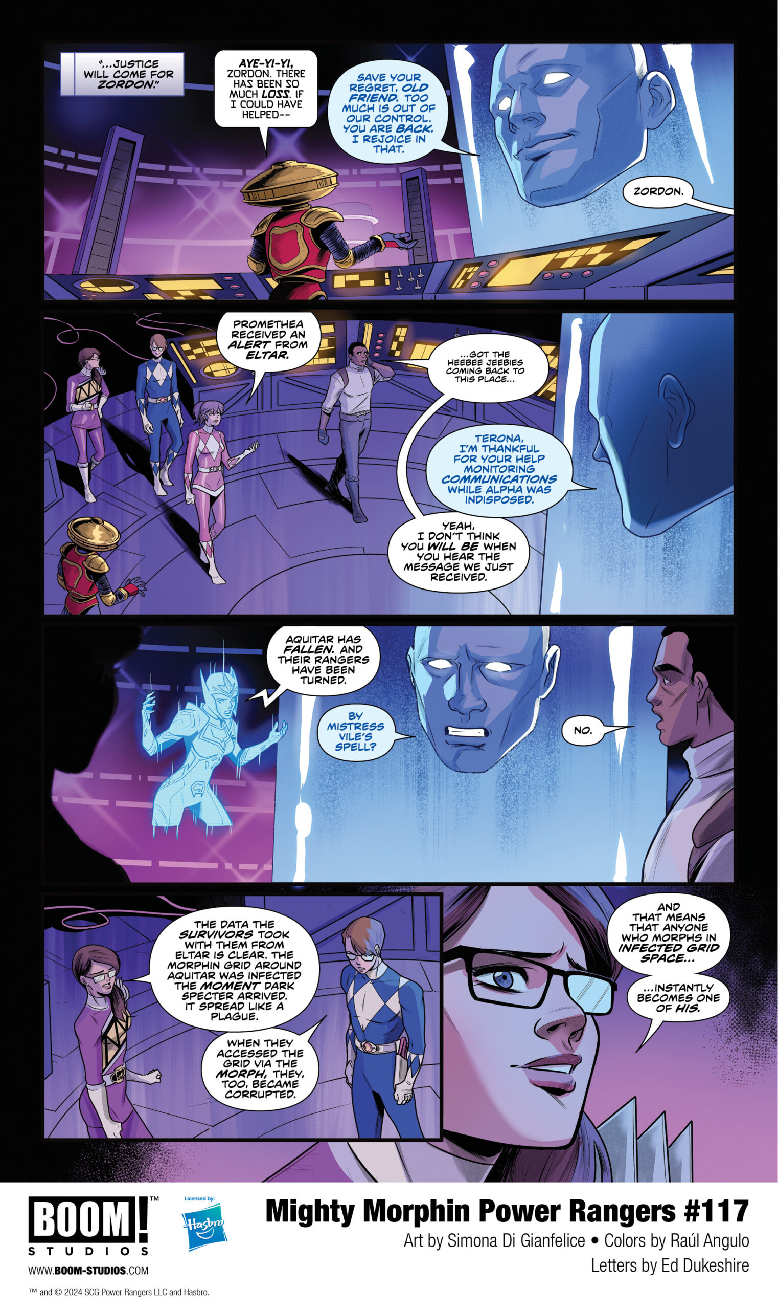 BOOM! Studios, under license by leading toy and game company Hasbro, Inc. (NASDAQ: HAS), revealed a first look at MIGHTY MORPHIN POWER RANGERS #117, the continuation of the DARKEST HOUR event, taking place after the bold and greatly anticipated Reunited, Recharged era of Mighty Morphin Power Rangers. The superstar creative lineup includes writer Melissa Flores (Power Rangers, The Dead Lucky), artist Simona Di Gianfelice (All New Firefly) with Marco Renna (Mighty Morphin), colorist Raúl Angulo (Mech Cadet Yu) with assistance by Jose Enrique Fernández, and letterer Ed Dukeshire (The Woods, Irredeemable) in the continuation of this monumental 12-month event, available in February.