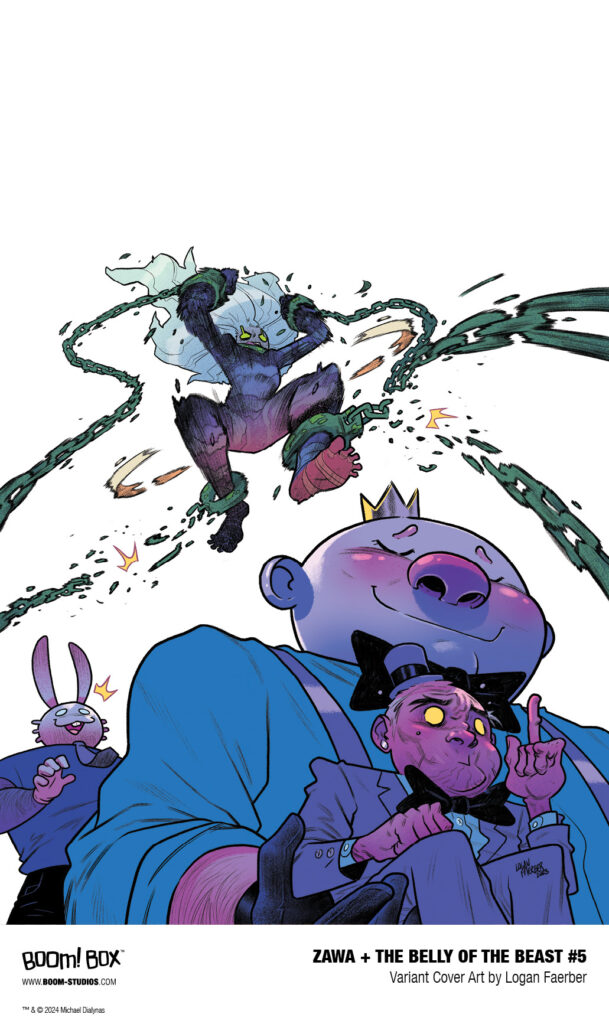 BOOM! Studios today revealed a first look at ZAWA + THE BELLY OF THE BEAST #5, the FINAL issue of the original series from GLAAD Award-winning and Eisner Award-nominated cartoonist Michael Dialynas (Wynd, Teenage Mutant Ninja Turtles). ZAWA + THE BELLY OF THE BEAST is a charmingly macabre eco-friendly fable about nature, greed, and good food shared with better friends, available March 2024.