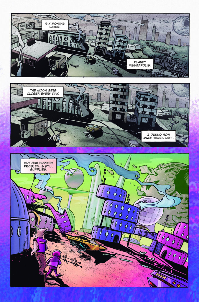 Orphans of the Impact Winter (thePullbox reviewed the first preview issue back in October of 2022) is a comic that tells the tale of an imaginative young boy named Chuck and his loyal dog Addie as they struggle to survive in a world where the moon is falling out of the sky. Coping by pretending that they are explorers in a sci-fi world, Chuck and Addie embark on a perilous journey to find salvation from the impending catastrophe.