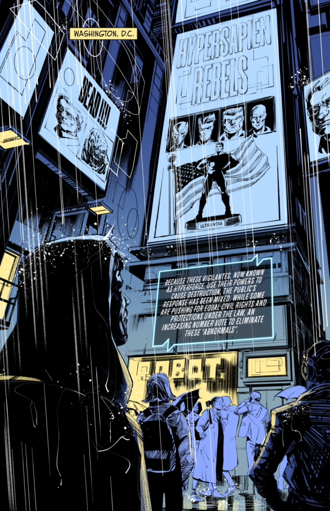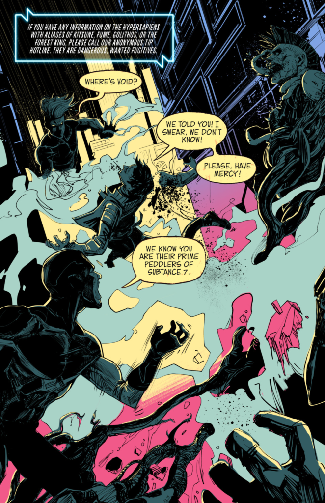 Billed as a “post-superhero” cyberpunk series, HyperForce introduces itself as a story full of gray areas, figuratively and literally. On the more ambiguous side, there don’t seem to be many “good guys” in its pages. There’s one truly heroic character mentioned, Ultranova, recently deceased and no longer standing as the ideal among hypersapiens (ie: HyperForce’s non-litigious stand in for “mutants”). In his place, the Fatal Fouresome (not their official team name) of Kitsune, Golithos, Fume, & the Forest King prowl among a populace that hates and fears them.