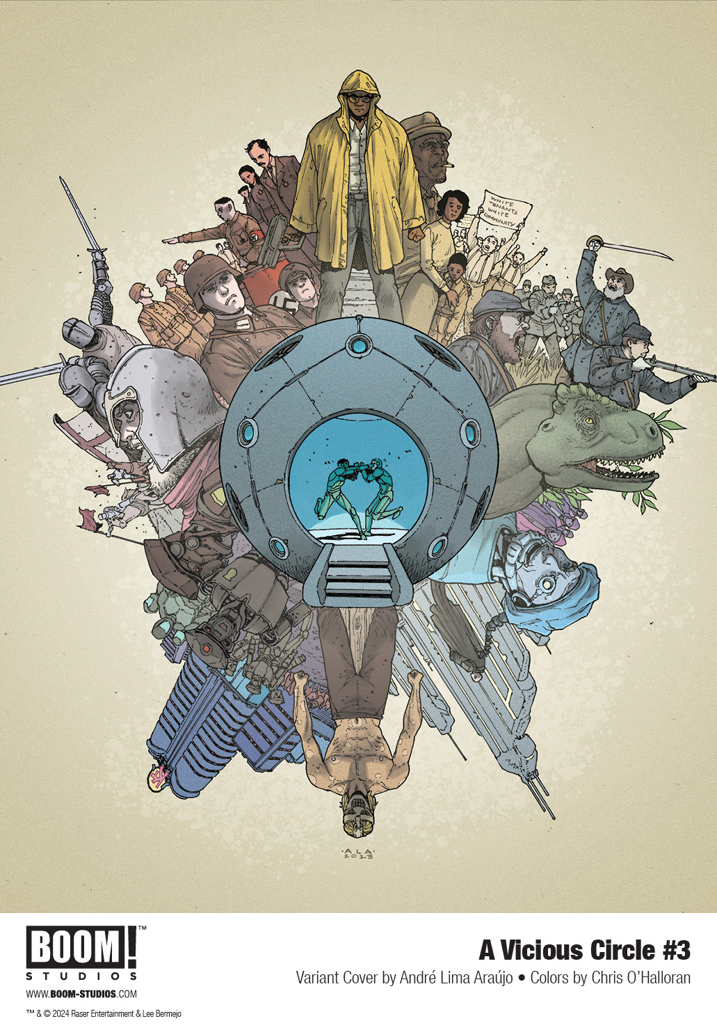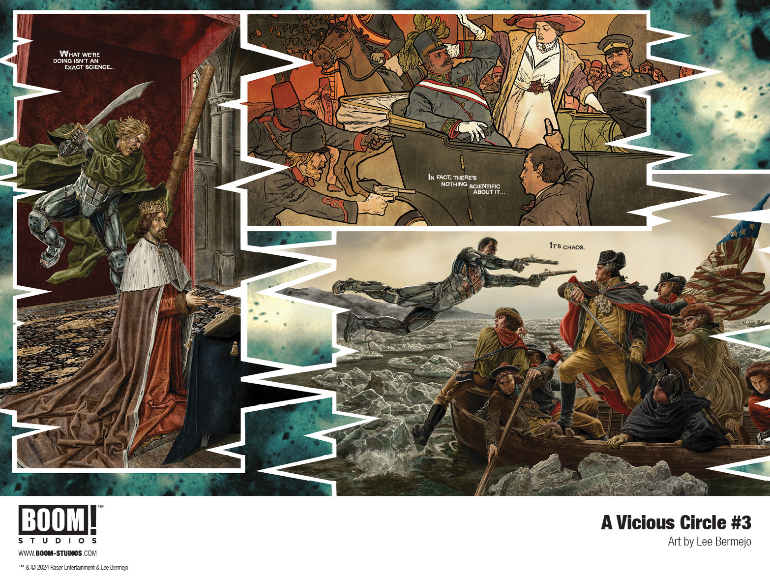 Hot on the heels of the announcement that Universal Pictures has landed the rights to A VICIOUS CIRCLE with Proximity Media and BOOM! Studios producing, BOOM! Studios revealed today a first look A VICIOUS CIRCLE #3, the brutal and highly-anticipated final issue of the time travel masterwork from the legendary Eisner nominated Lee Bermejo and The Batman Part II and BRZRKR screenwriter Mattson Tomlin. Coming to comic shops in August 2024.