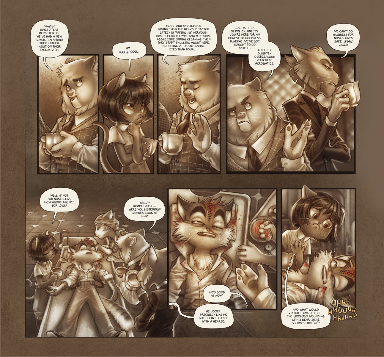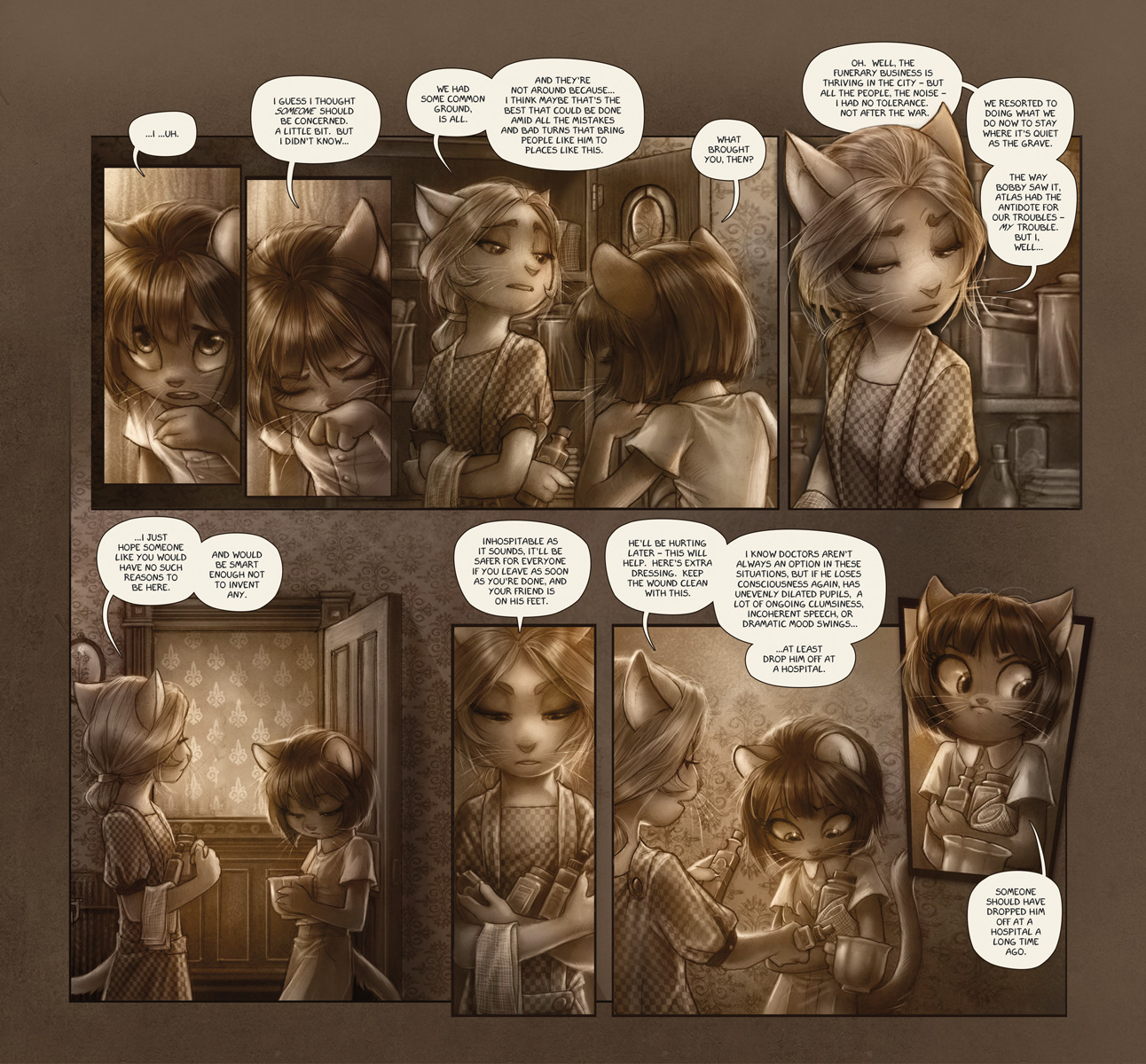 After a violent raid from a rival operation left bullet holes all over Lackadaisy – and inside Mitzi’s trusted confidante Viktor – the situation is getting desperate in the glamorous pleasure palace hidden under the unassuming Little Daisy Cafe. As her charms fail to secure new business partners and the faith of her posse waivers, ambitious external forces press ever closer in. The gang struggles to secure booze, suss out new connections, and recover from recent traumas, all while the walls keep closing in.