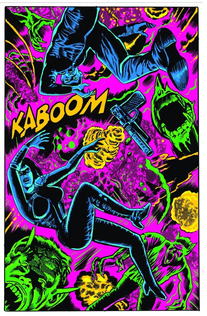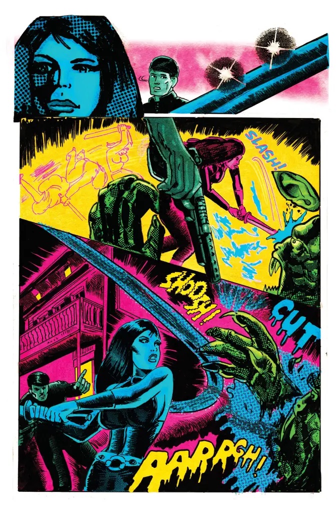“Coloring the work of underground legend, Ken Landgraf, is a blast,” says Meesey. “His art bridges the gap between our reality and another bizarre 1970s-infused hyper-exciting alternate universe that aligns perfectly with the world of GHOST Agents. My goal is always to support the work with color and give it a strong finish while letting his singular linework shine through.”