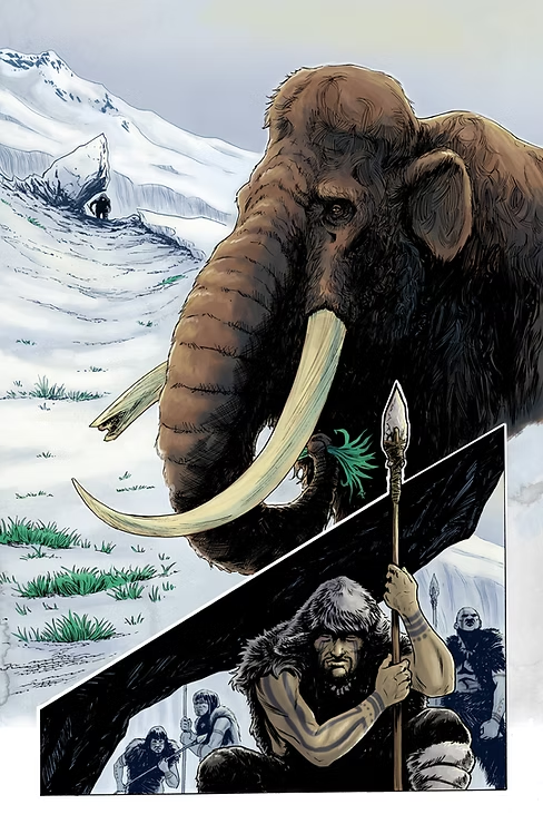 Reda tells the story of a group of Paleo-Indians as they follow their food (a herd of mammoths) across the Berring Land Bridge, to what would some day be known as North America. The story runs in two parallel lines, tracking the adventures of a man and a woman as they make the journey separately. Dissatisfied with the status quo, “Clovis” forges ahead after clashing with a rival hunter during lean times. Soon enough, “Sierra” follows accompanied by a group who splinter off from the larger tribe hoping to find a better life. Both are leaders, leaving the known path for the chance at a better future for themselves and their people.