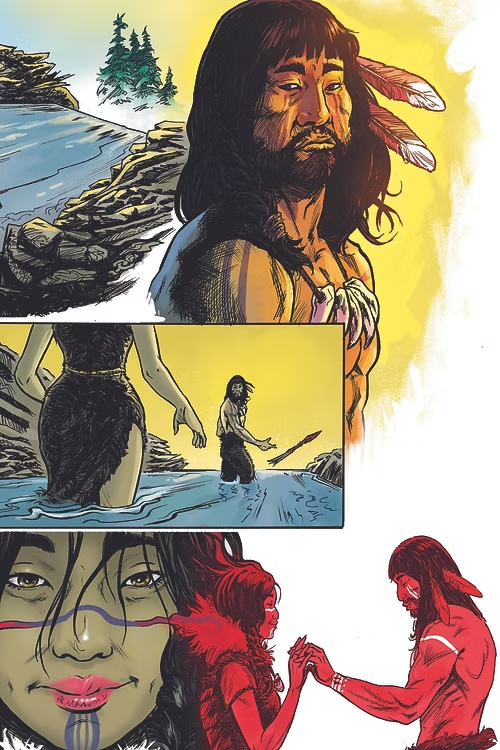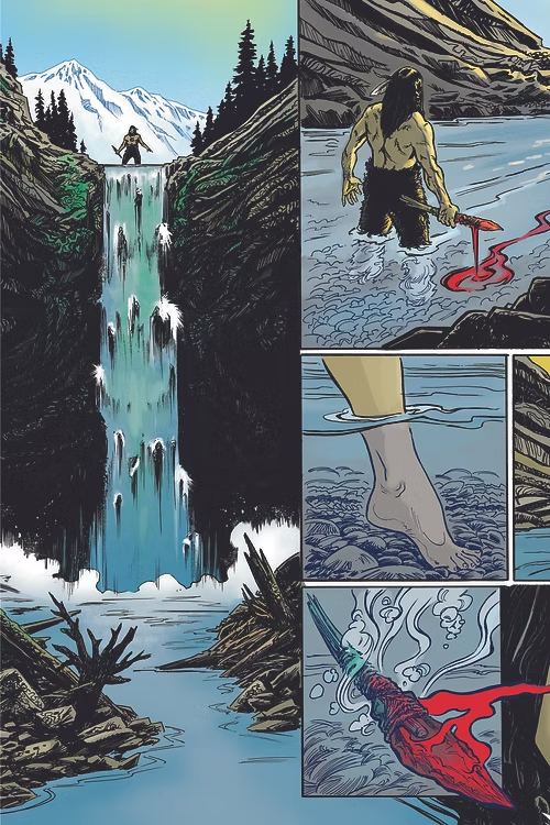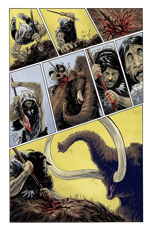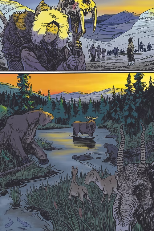 Galusha’s work nails it from page one. It isn’t just a matter of matching art to the script, because the art is a huge factor in telling a story like this. The collaboration in the creation of The First Americans had to be dialed in from the start. It’s in Galusha’s attention to detail. His character designs need to show who these people are in everything from posture to facial expressions because there are no grand monologues to do the lifting. Farther than that, Galusha dug deep to make sure the animals… even the extinct ones… and their environments look believable and alive on the page.