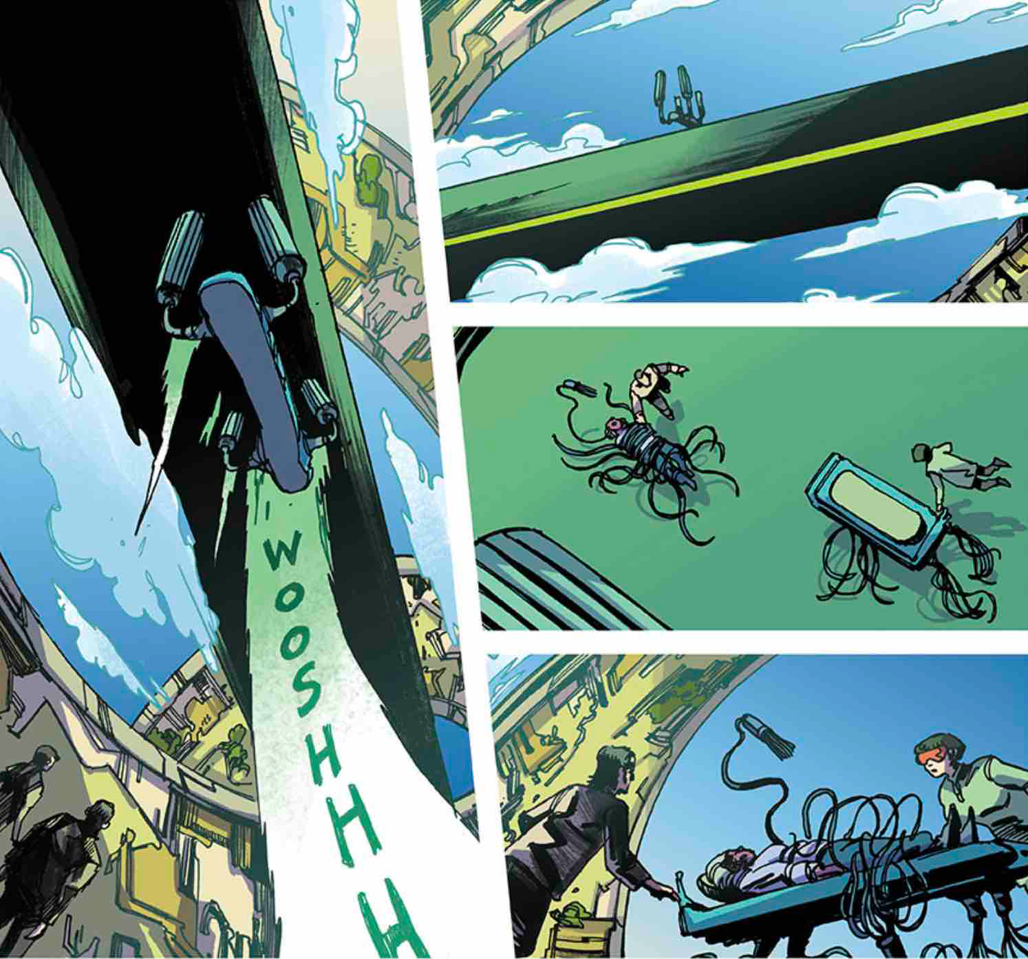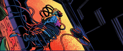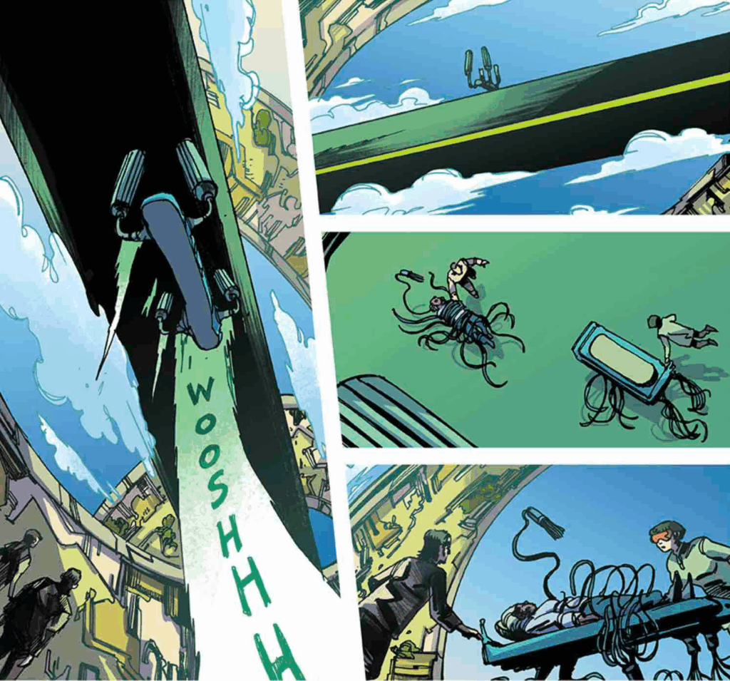 Collins describes Arks Helices as, “a bio-punk-noir detective story, blending eldritch horror with high-concept science-faction storytelling. I had a rough outline for Helices but wasn’t planning on writing it until after Issue 6 of Arks was shipped, but when I found out that Gustaffo (Vargas) was available, I basically wrote all three issues in record time as I didn’t want to miss the chance to work with him.”