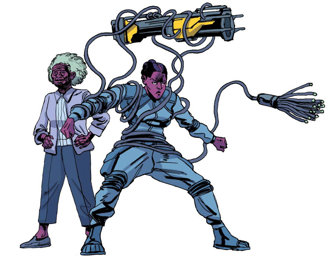In Arks Helices #1 , we follow Olive , a 24,000-year-old bio-punk-noir detective whose consciousness is split into the mind of Moxy , a single mother living on the colony below. When Moxy discovers that the ancient evil hunting humanity has found them again, Olive must make an impossible choice: kill 800 colonists to keep the Helices hidden — or risk the extinction of humankind.
