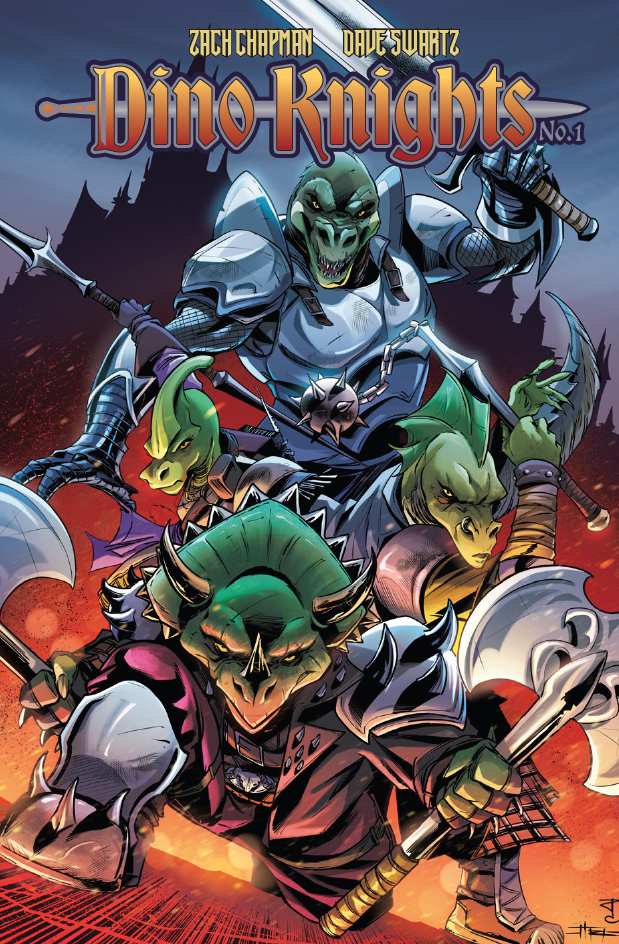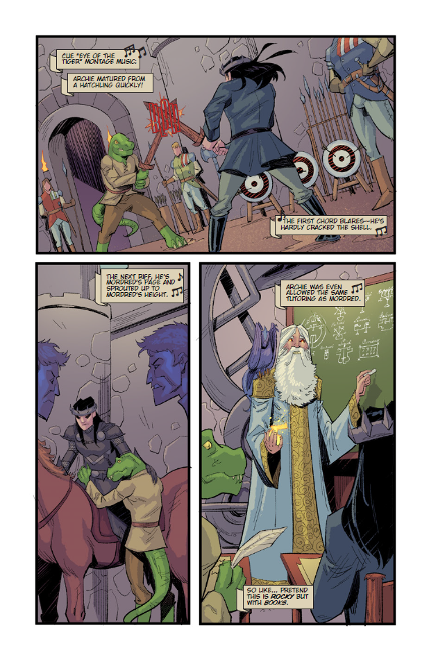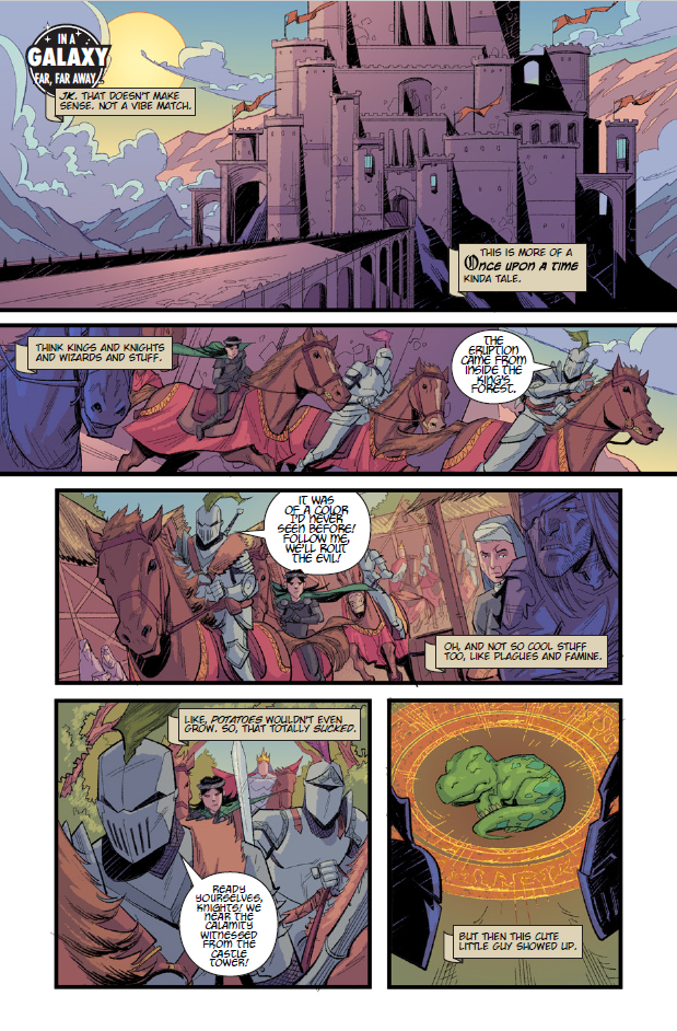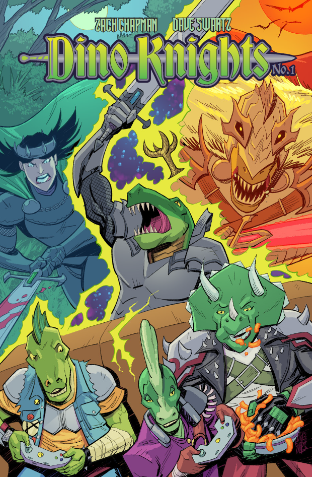 Writer Zach Chapman has yet to find a lane he’d like to stay in. He’s written some bangers, like A Haunting on Mars (sci-fi horror), Spellslinger (weird west), and Kaiju Blues (punk rock heroes fighting giant monsters). Next up, he’s set his sights on the left-of-center blend of science fiction fantasy, seasoned liberally with more pop-culture references than you can shake a sword (freshly pulled from a stone) at. The humor is exactly what you’d expect, and the characters line up nicely with their respective archetypes: the surly scrapper, the quippy guy, the quirky sciencey inventor, and… you get it.