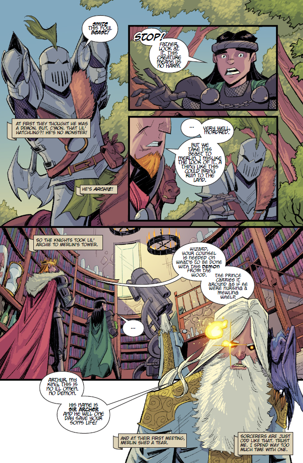 All of that can add up to a fun read, which Dino Knights is, but Chapman throws in extra layers for the pickier readers. Archie, our heroic Dinosaur of Destiny, carries with him all the troubles of one born out of place. As we might imagine, despite the support of Merlin and King Arthur, being a talking T-Rex and all makes it tough to meet new people in medieval England. But he clings to his knightly ethics, following the chivalric code no matter where it leads. When that path takes him to modern New York City, things get more complicated and Chapman leans into it without losing sight of the wackiness of it all.