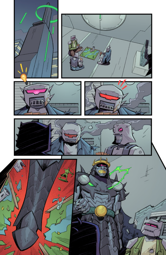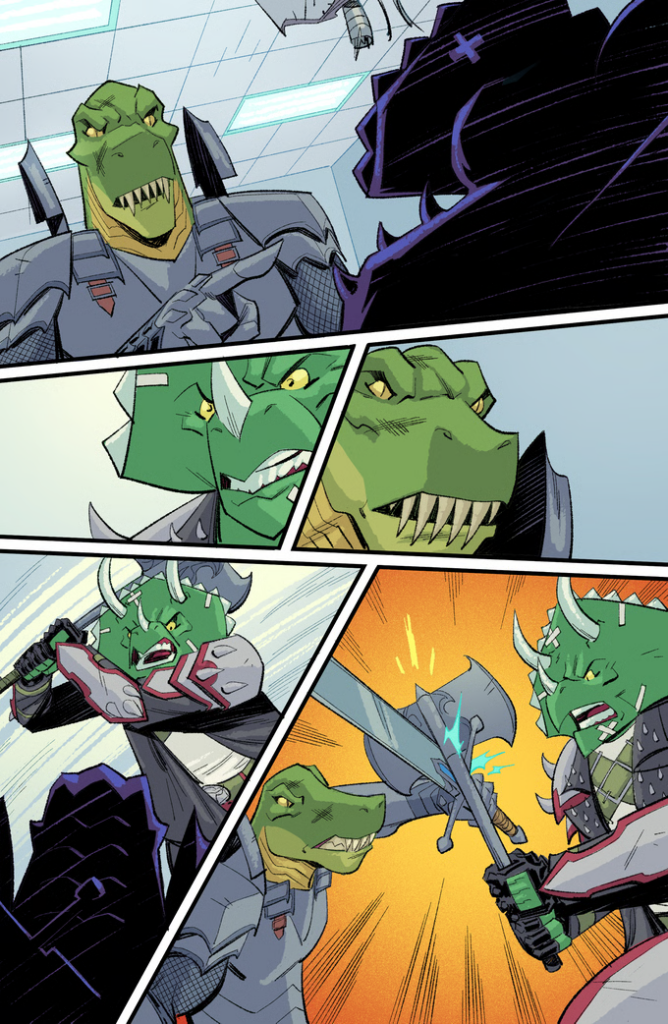 The first six-issue story arc is illustrated by a trio of talented folk, all bringing a specific style to this bizarre world of talking dinosaurs and robot Crusaders. Dave Swartz (issues 1, 2, 5, & 6) is very much in tune with the Saturday morning cartoon of it all. Briane Andan (issue 3) brings more kinetic energy to the work, very well-suited to the issue’s big action set piece. Sergei Titov (issue 4) has a more classic comic book look, with sharp, clean lines, and interesting panel layouts. I don’t know if the artists illustrated their respective issues because of scheduling, or if they were picked specifically for the style they brought to different parts of the story. I just know that the visual shifts worked, without breaking up the tone.