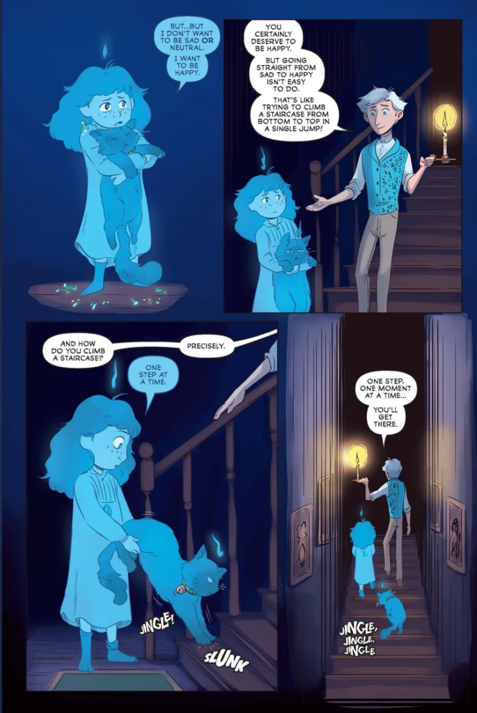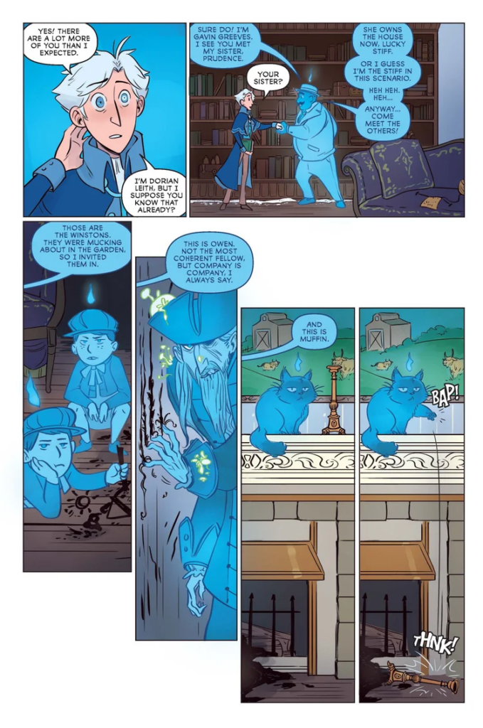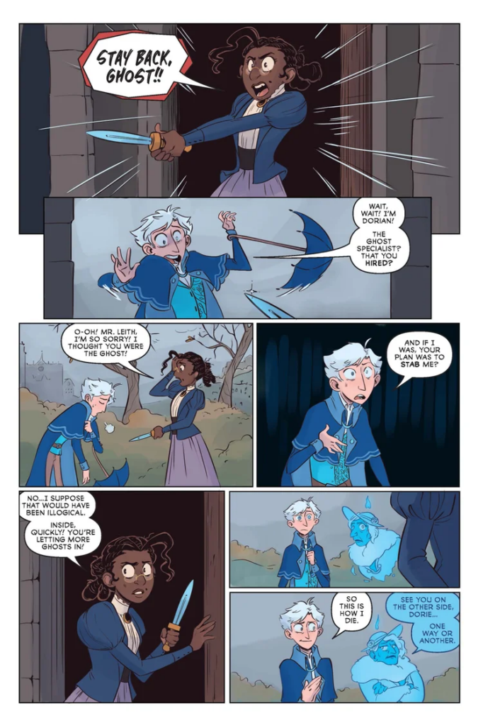 The Ghostkeeper’s art fits the writing perfectly, with panels slipping from bright colors to gothic grays to suit the tone of the moment. There’s just enough detail to give the work an animated look, which makes some sense as Johanna Taylor also works as an animator. Handling the writing along with the illustration puts her alongside a list of creators like Frank Cho and Stjepan Šejić, able to take both aspects of the creative process and make some magic happen.